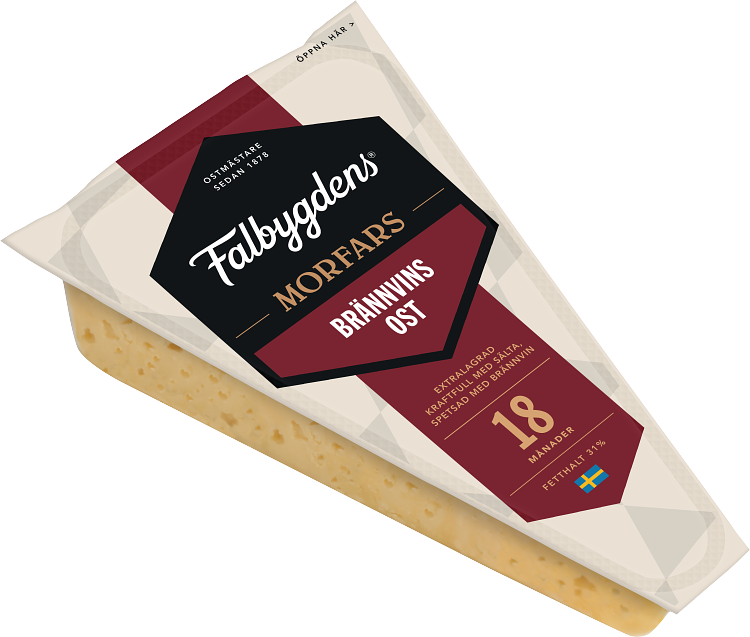 En långlagrad version av Sveriges första brännvinsost. Osten har här lagrats i 18 månader och sedan smaksatts med ett extra kryddigt brännvin. Extra lagrad ost, som Falbygdens® Morfars Brännvin 18 mån 31%, har en kraftig och fyllig smak med rejäl sälta. Morfars Brännvin passar perfekt till skaldjur och i alla recept med en smakrik ost som ingrediens. Precis som annan vällagrad ost är den även god på smörgåsen. Passar utmärkt att servera som en lagrad hårdost till ostbrickan.