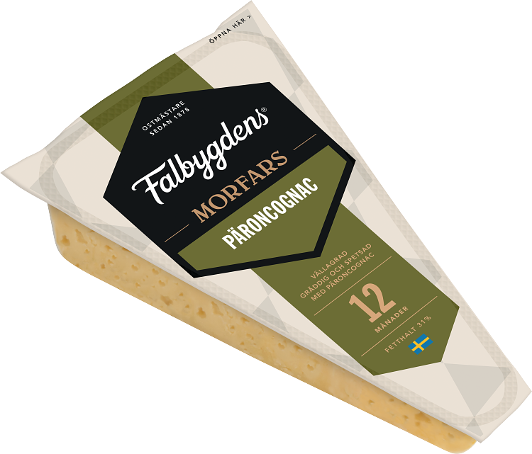 Svensk hårdost lagrad i 12 månader och som spetsats med en underbart smakrik päroncognac. Den är en unik lagrad hårdost, god och kraftfull med perfekt avvägd sälta, karakteristiskt fruktiga pärontoner och fyllighet från cognacen. Falbygdens® Morfars Päroncognac 12 mån 31% är grynpipig, vilket innebär att den har många små oregelbundna hål. Det är en vällagrad ost som passar utmärkt till en lufttorkad skinka, på ett gott kex eller till en lyxig ostbricka.