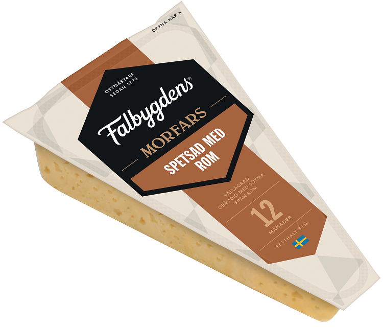 Svensk hårdost lagrad i 12 månader, spetsad med Rom. Den är en unik lagrad hårdost, god och fyllig med perfekt avvägd sälta och runda fruktiga toner av rom med en touch av russin. Falbygdens® Morfars Rom 12 mån 31% är grynpipig, vilket innebär att den har många små oregelbundna hål. Passar utmärkt att servera som en smakrik hårdost på ostbrickan.