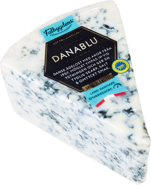 Falbygdens® Rekommenderar Danablu är en klassisk dansk blåmögelost med medelstark smak och lagom sälta. Danskarna har länge varit mycket duktiga på att tillverka ädelost av typen blue cheese. Danablu uppfanns 1927 som ett alternativ till Roquefort. Denna ost har blivit en stor framgång och säljs över hela världen. Att tillverka en smakrik ädelost är en konst. Ett mögelämne ympas in vid ostens ystning och bildar ostens mögelstruktur. Med hjälp av nålar injiceras luft i osten. Syre kommer då in i osten och mögelutvecklingen startar. När ostarna lagrats i 2-5 månader är de klara att avnjutas.
