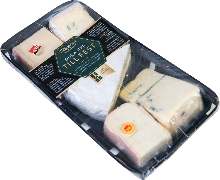 Ostbricka färdig att servera! Falbygdens® Rekommenderar Duka upp till fest ostbricka bjuder på ost i många kontrasterande smaker och ostfamiljer. Här finns en Taleggio kittost 26%, en underbar italiensk ost med stark smak och tydlig sälta. Här finns även Brie du Grand Père, en smakrik fransk Brieost, tillsammans med populära Kvibille Ädel Special blåmögelost samt Castello Saga, en välsmakande vit- och blåmögelost. Och som kronan på verket Gruyère Réserve opast, den smakrika, extralagrade hårdosten från Schweiz.