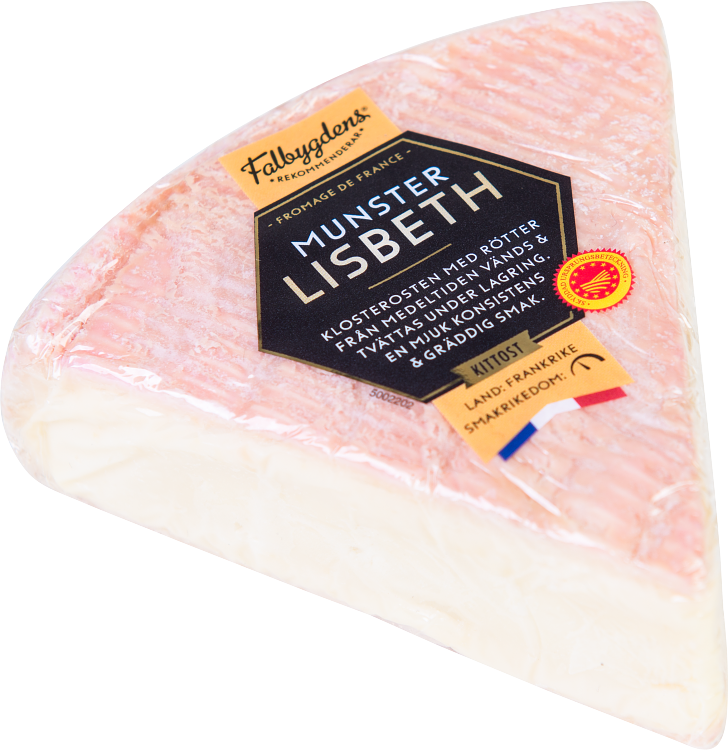 En kittost med en gräddig och nötaktig smak, framträdande doft och krämig i konsistensen. Falbygdens® Rekommenderar Munster Lisbeth är en speciell dessertost. Det är en gammal klosterost med rötter från tidig medeltid. En ost som får sin unika karaktär från de oförstörda betesmarkerna i Alsace och Vosgiennes där korna är välkända för att ge proteinrik mjölk. Munster Lisbeth lagras i källare i två till tre månader och vänds och tvättas varannan dag. Osten finns både som opastöriserad och pastöriserad, Munster Lisbeth är pastöriserad. Den är en pikant ost till ostbricka.