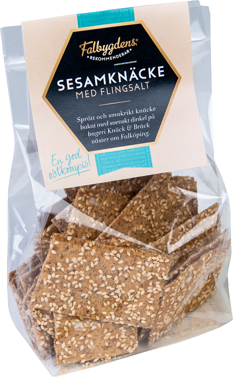 Sprött och smakrikt knäckebröd, ett perfekt tillbehör till ostbrickan. Bakat med svenskt dinkel på bageri Knäck & Bräck väster om Falköping. Falbygdens® Rekommenderar Sesamknäcke Flingsalt är delikat med en bit vällagrad svensk ost likaväl som en krämig brie eller langres.